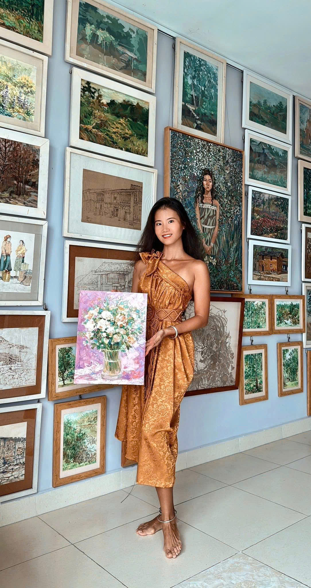 Thực hành của họa sĩ Hồ Lan xoay quanh các hình ảnh thiên nhiên, hoa lá, cỏ cây và chân dung.