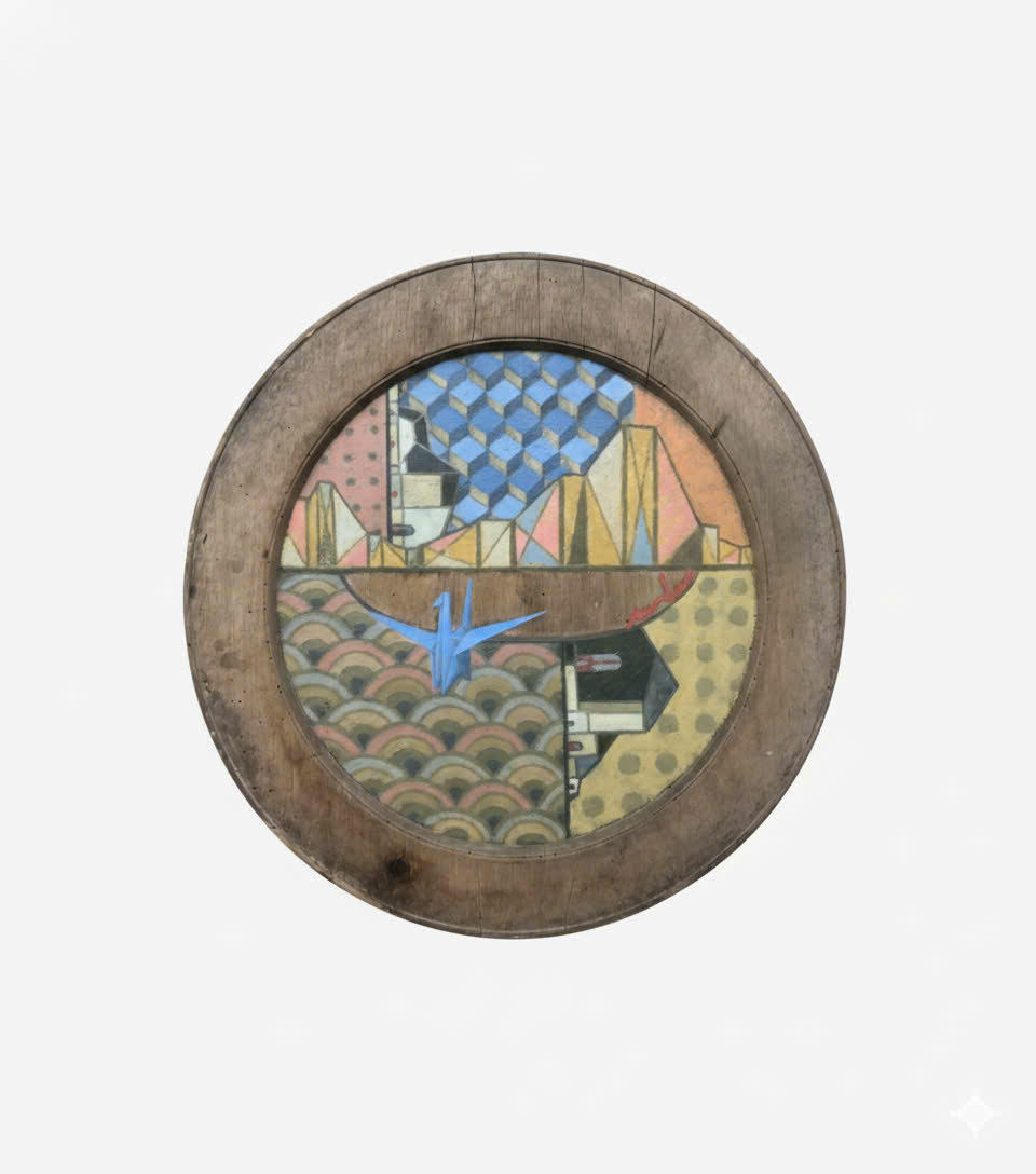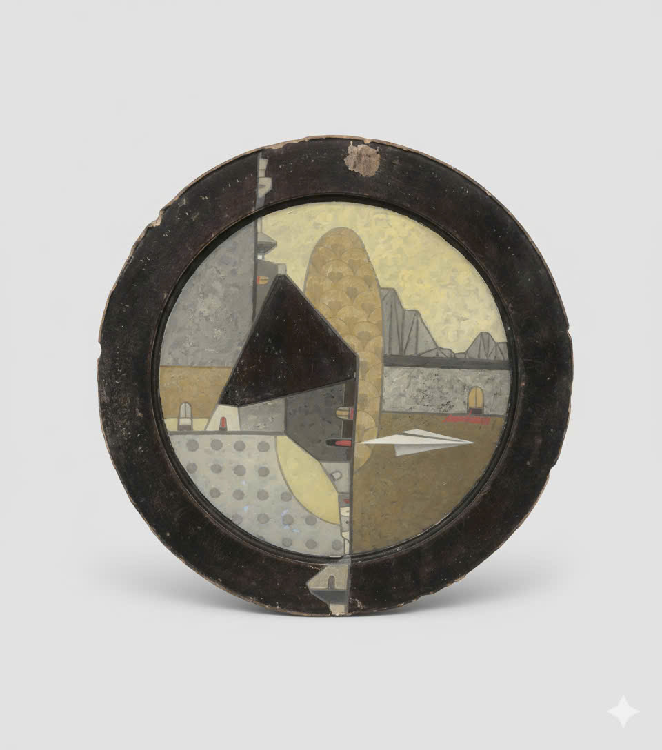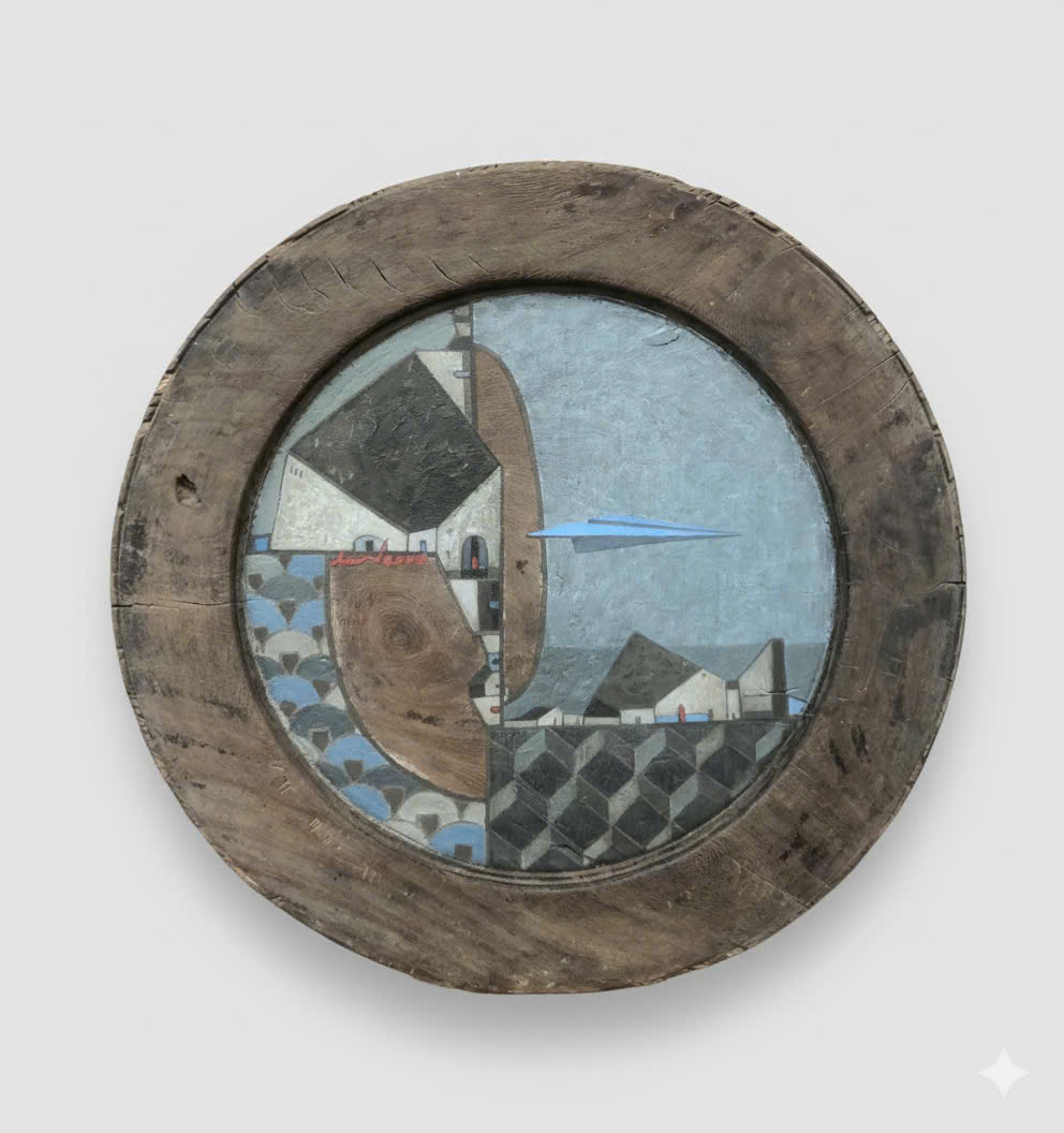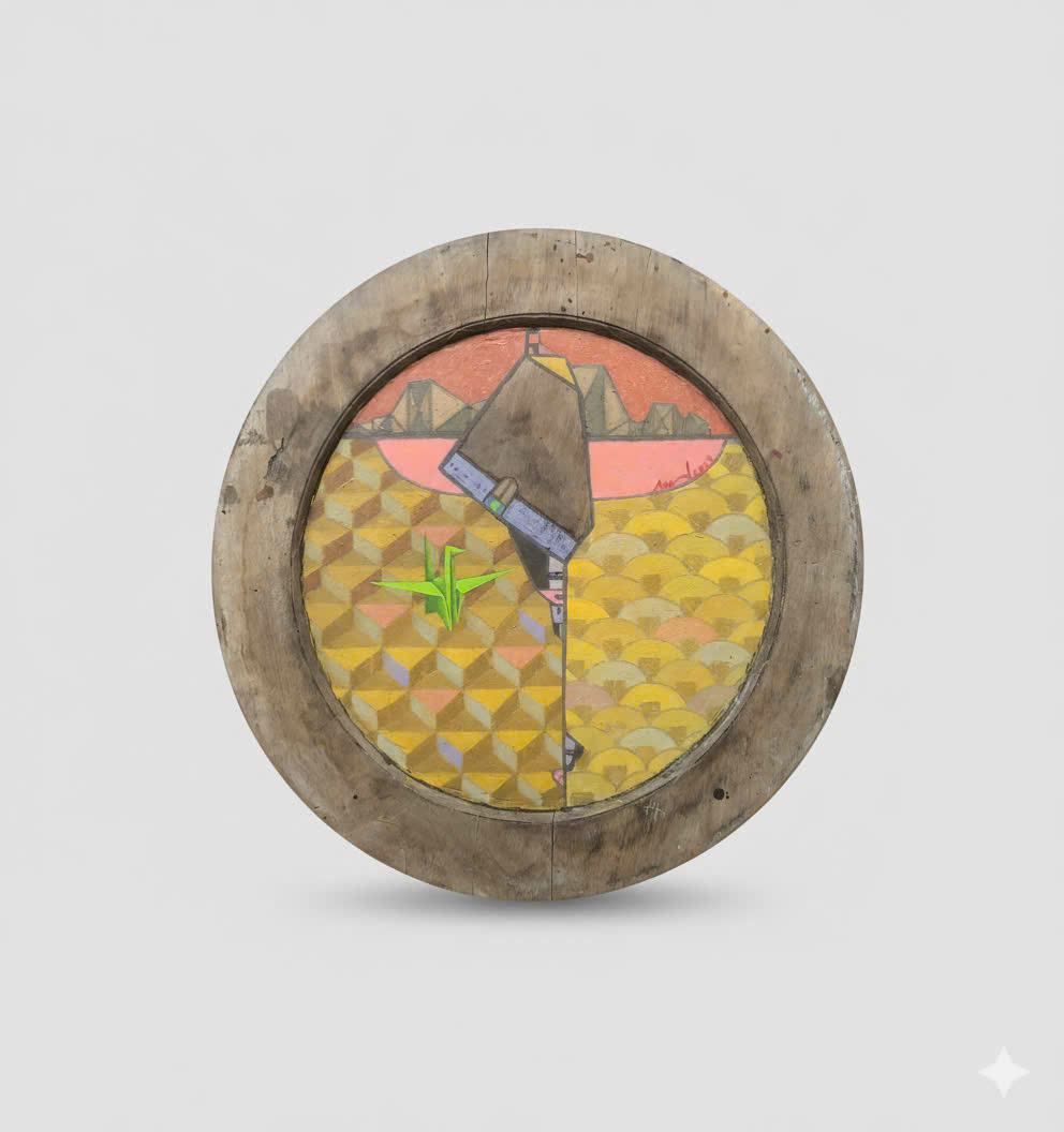 Trên bề mặt mâm, Phố – Làng – Hạt gạo hiện ra lặng lẽ, chồng lớp và hòa vào nhau. Người họa sĩ không che giấu dấu vết thời gian, mà giữ lại từng thớ gỗ mòn, từng vết nứt, từng dấu tích đã hằn sâu qua năm tháng – như một cách gìn giữ ký ức sống động và chân thật nhất. Ở đó, hội họa không áp đặt, mà lắng nghe và đồng hành cùng chất liệu.