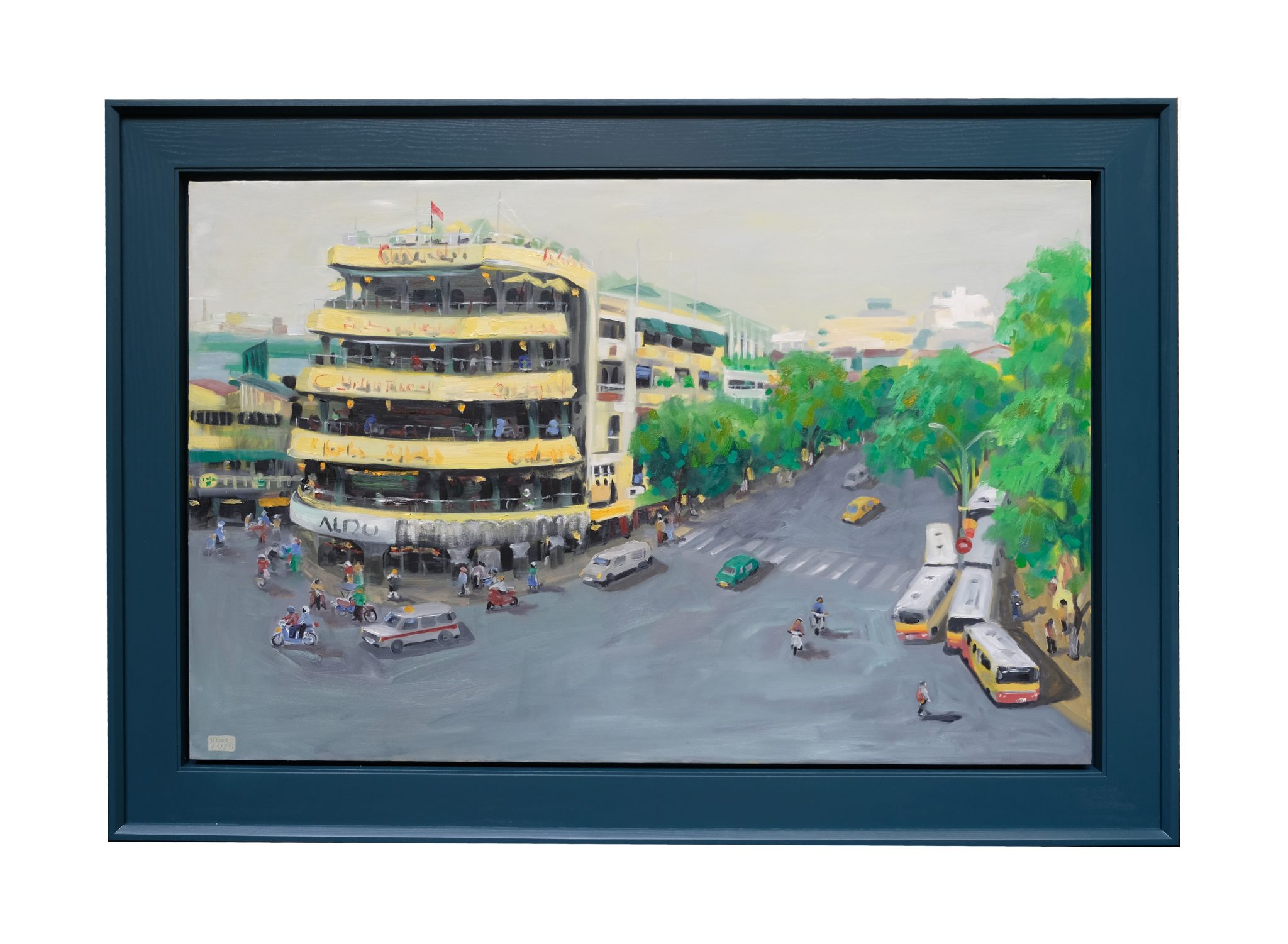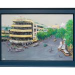 Một lát cắt đặc biệt về Hà Nội – nơi quá khứ và hiện tại hòa quyện trong gam màu hoài niệm. Tòa nhà biểu tượng thủ đô nơi góc phố, dòng xe, những bóng cây cổ thụ… tất cả hiện lên qua nét cọ khoáng đạt, gợi nhớ về dung mạo đô thành một thời, đánh thức cả khoảng ký ức dịu dàng trỗi dậy.