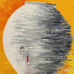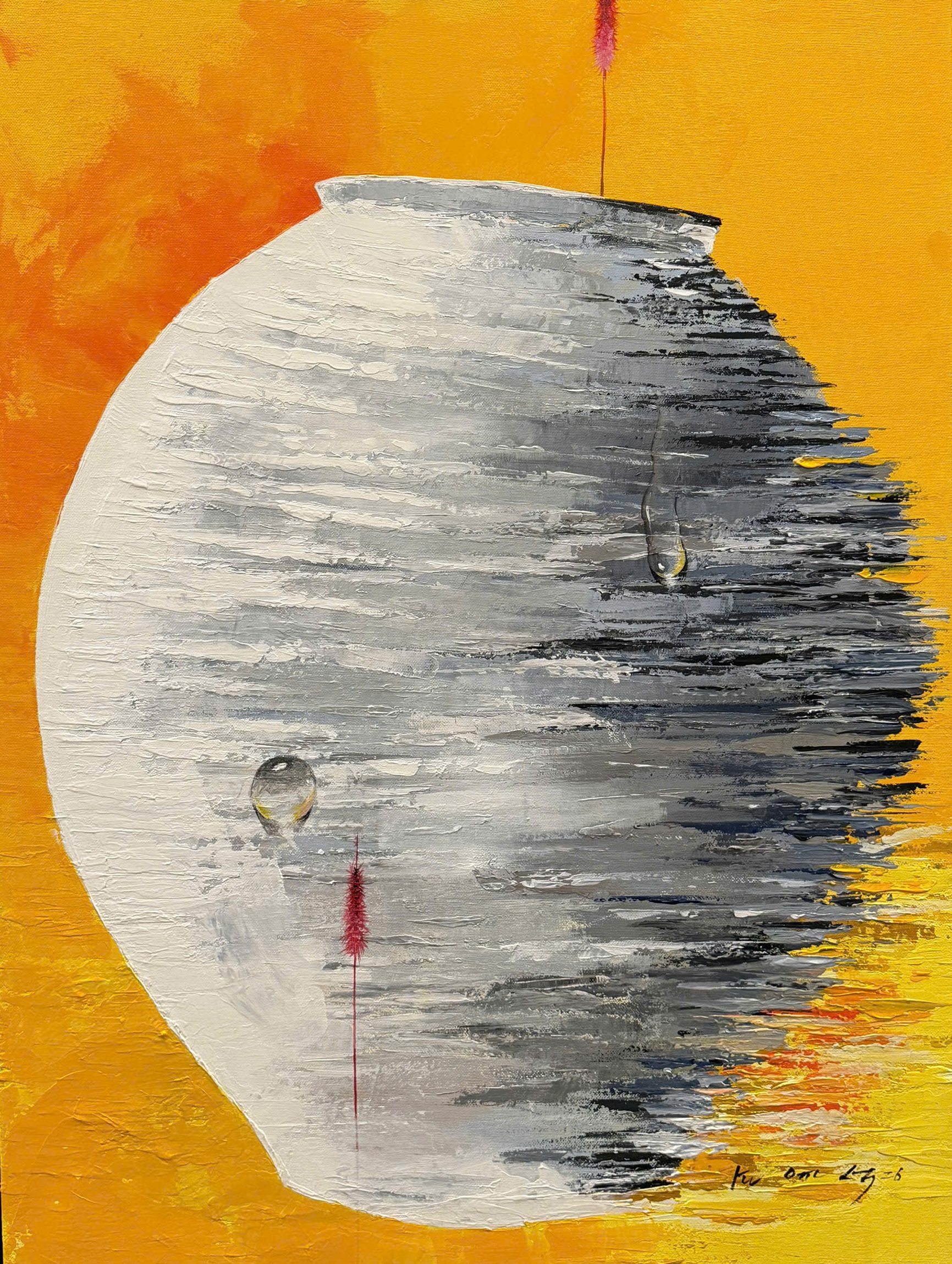 Trong bố cục tối giản, chiếc bình trắng hiện lên như một hình khối tĩnh tại giữa nền vàng rực rỡ. Tuy nhiên, phần bề mặt bên phải dường như bị xóa nhòa, tan chảy trong những vệt cọ mạnh và gấp gáp. Những giọt nước nhỏ lặng lẽ rơi xuống như dấu vết của một cảm xúc chưa kịp gọi tên. Tất cả tạo nên cảm giác một điều gì đó đang ở giữa chừng — chưa hoàn tất, chưa khép lại.