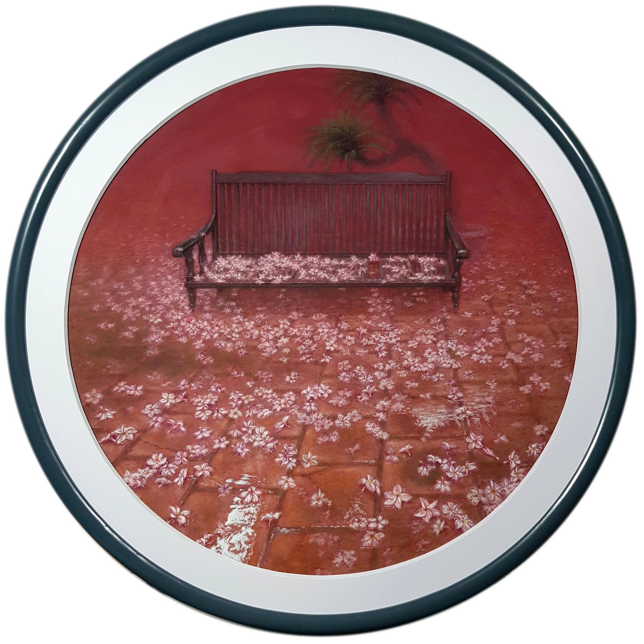 Một khoảng sân gạch xưa, một chiếc trường kỷ cũ, và những cánh hoa rơi phủ đầy mặt đất sau cơn mưa vừa tạnh. Không khí ẩm ướt, bảng lảng hơi sương… tất cả được họa sĩ Nguyên Pastel ghi lại bằng phấn màu – chất liệu tinh tế, nơi từng lớp bột mịn thấm đẫm cảm xúc, chạm đến sự tĩnh lặng và sâu thẳm của ký ức.