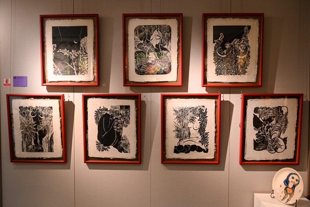 Mỹ Ngọc (1982), hội viên Hội Mỹ thuật Việt Nam, sử dụng kỹ thuật khắc bản in cao su đen – trắng. Thân thể phụ nữ và thiên nhiên đồng hiện trong sự tương phản mạnh, bố cục ẩn – hiện rõ nét, tạo nên vẻ đẹp mộc mạc nhưng giàu chiêm nghiệm.